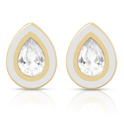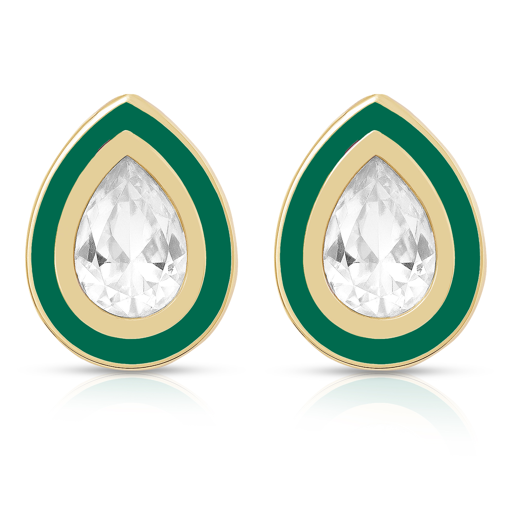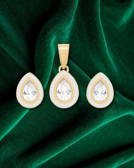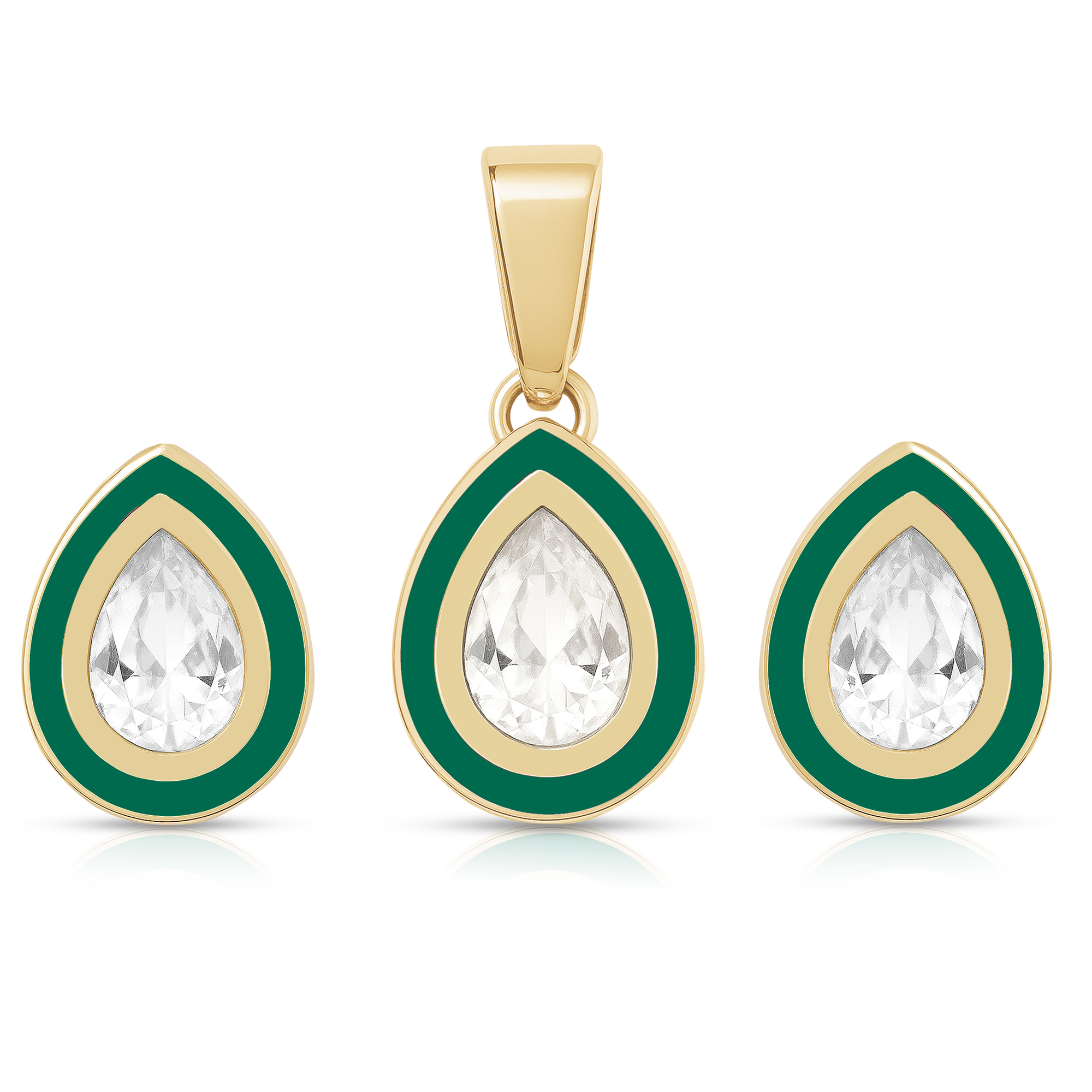 The pendant, crafted in a graceful teardrop shape with a glossy bottle green enamel, is accented with delicate crystals that shimmer with every glance. Paired with matching earrings, the set is a perfect expression of elegance, luxury, and sophistication.