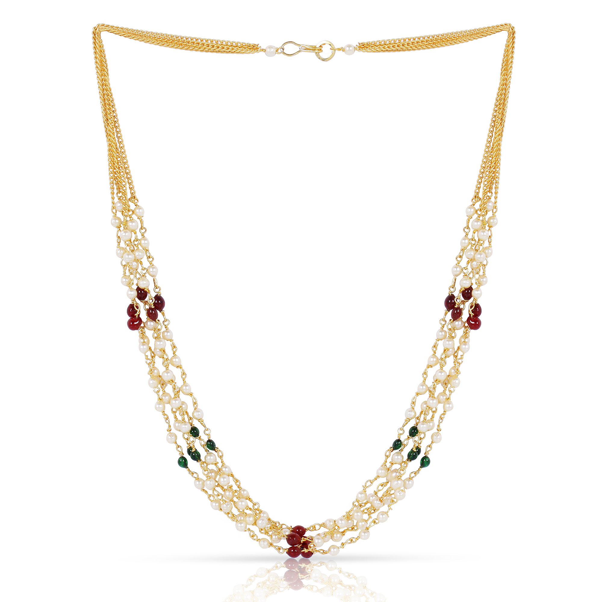 🌟 Crafted with a premium Elegant Necklace Blends Tradition with a Touch of Vibrancy—Featuring Multiple Strands of Pearls Adorned with Ruby-Red and Emerald-Green Hydro Beads, All Strung on a High-Polish Gold Chain.✨