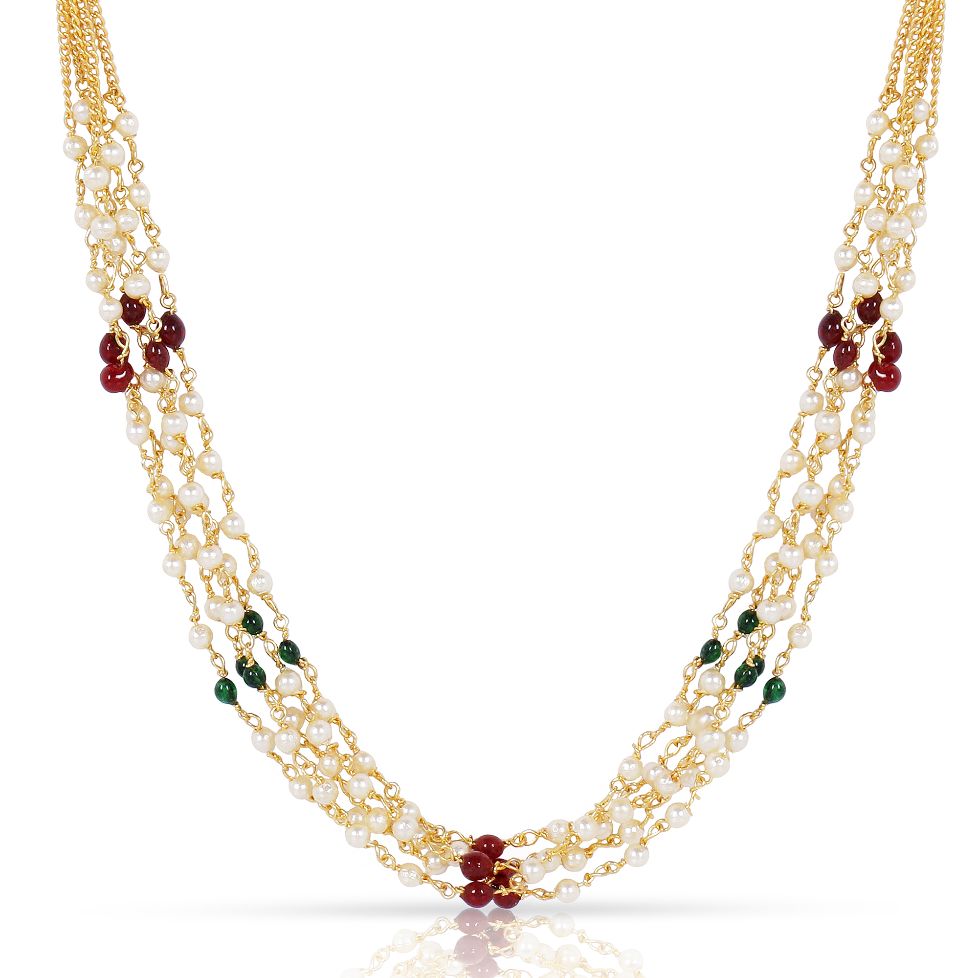 A necklace that tells a story of tradition and grace, the Multi-Strand Pearl Necklace with Red & Green Beads is designed to bring timeless beauty to your collection.