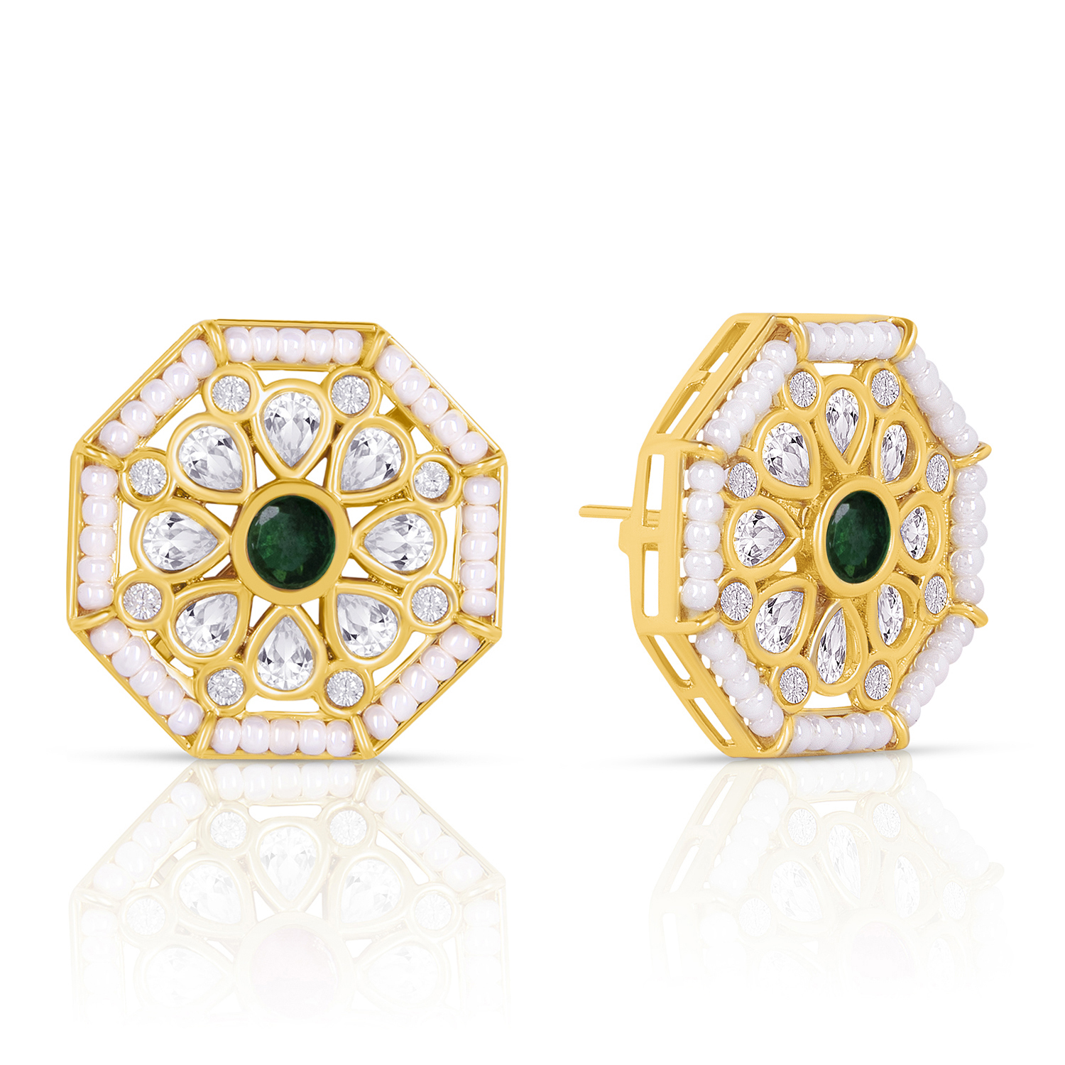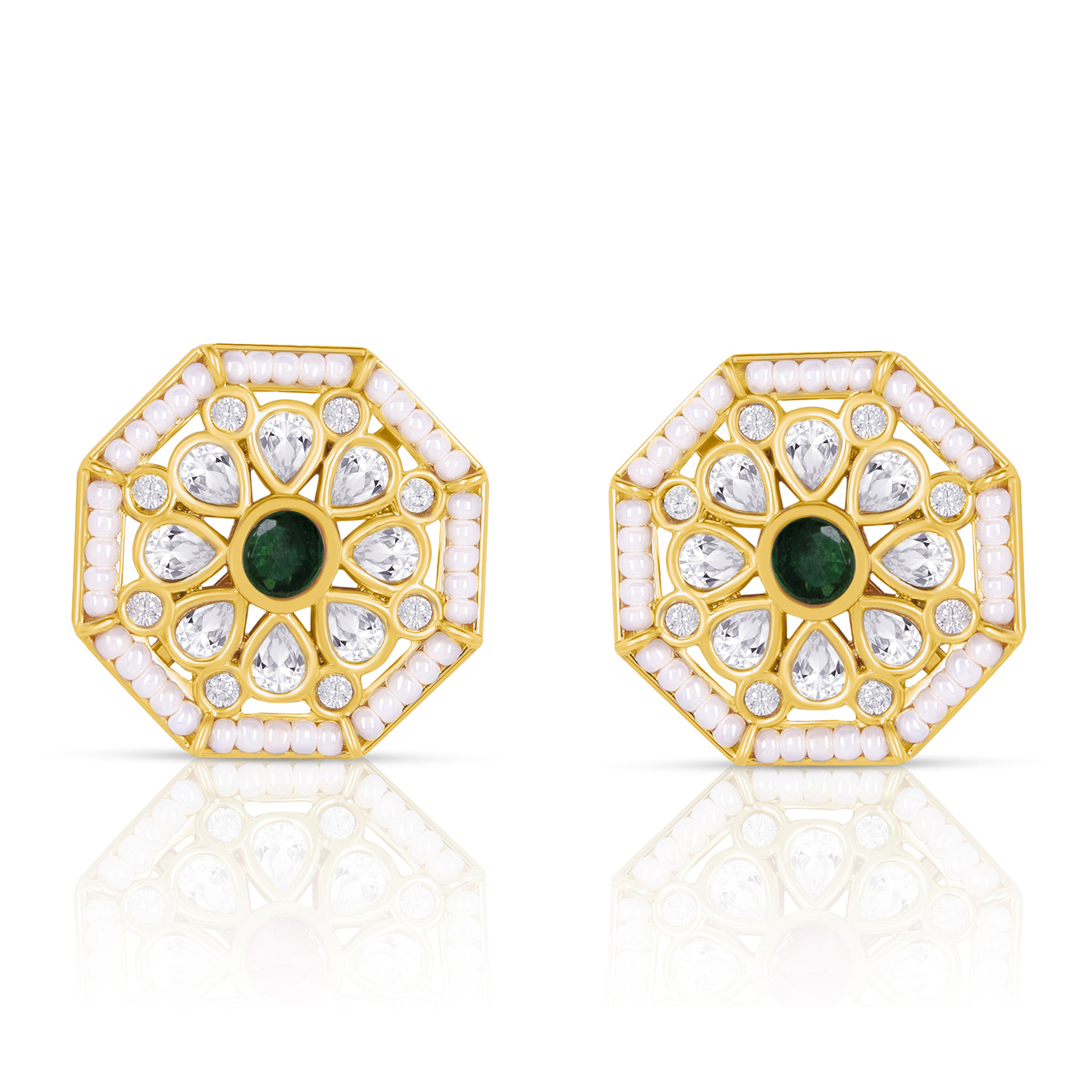 🌟 Crafted with a premium Gold-Finish Octagon Earrings With Pearl Accents, Transparent Stones and a Bold Dark Green Centre. A Perfect Blend of Tradition and Elegance