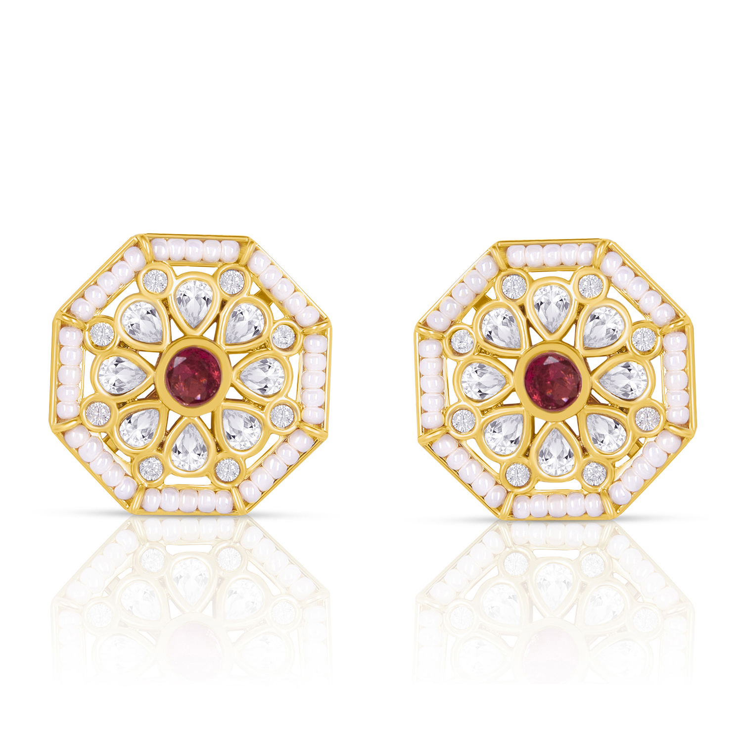 Crafted in a sleek octagonal design, the earrings are highlighted by a striking ruby red center stone—a symbol of passion, power, and timeless beauty. The bold red hue catches the light effortlessly, adding a touch of drama and sophistication to your look.