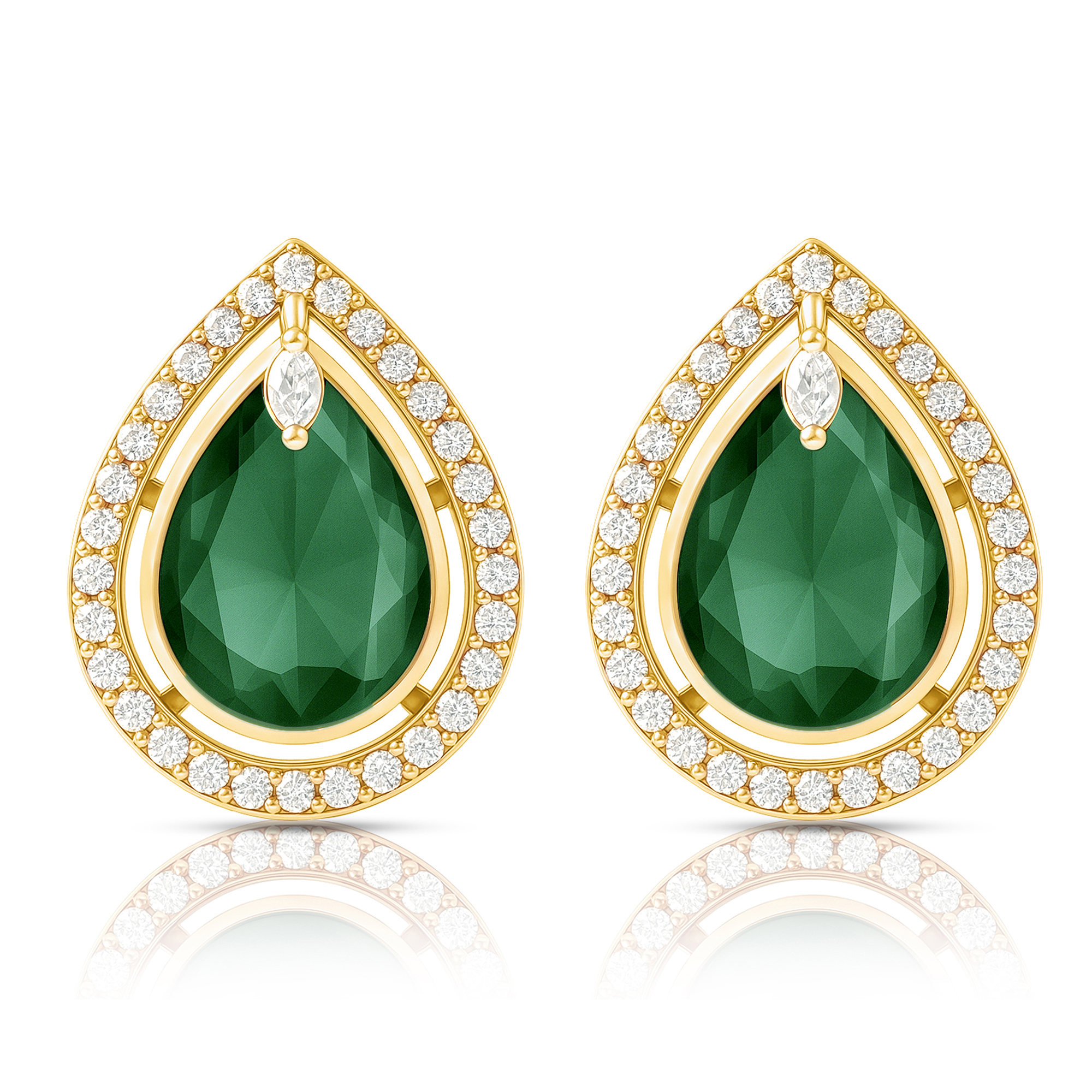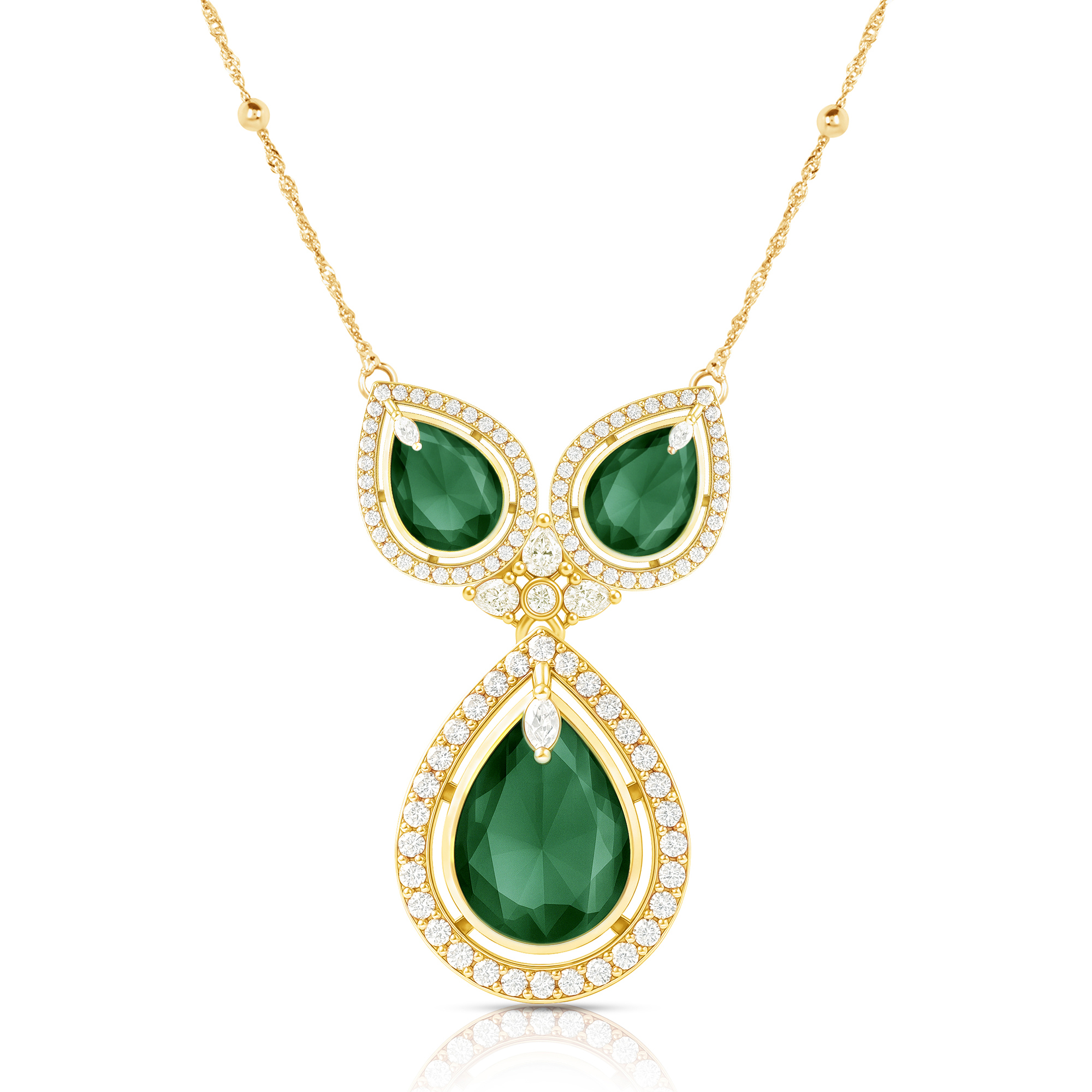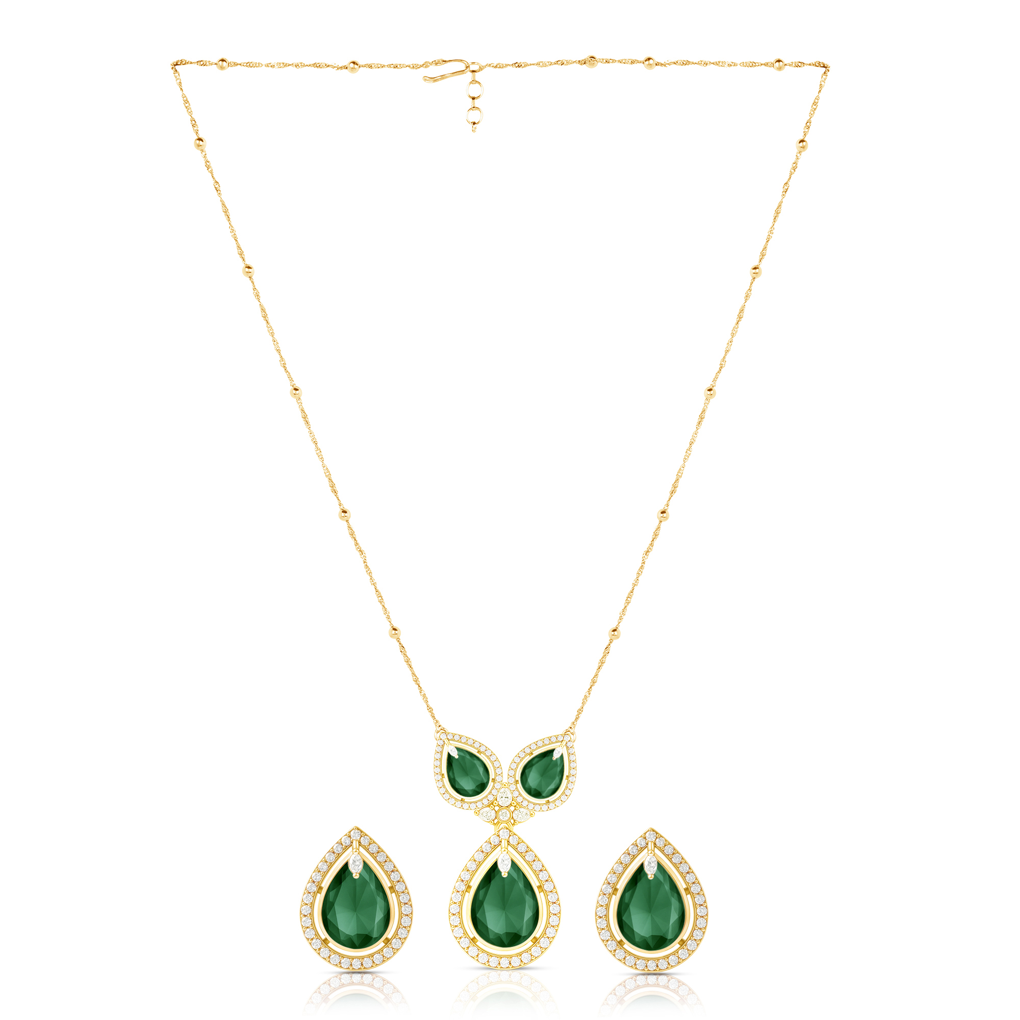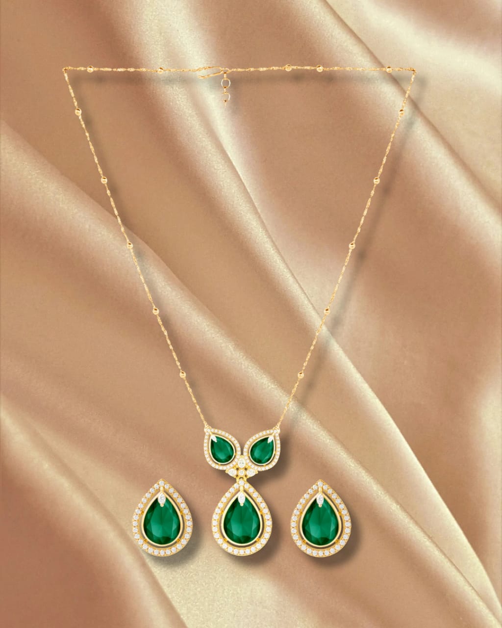 The dewdrop-inspired design is brought to life with luminous bottle green stones, a color long associated with royalty, harmony, and confidence. Suspended delicately on a sleek chain, the pendant pairs beautifully with matching earrings, creating a complete look that exudes charm and refinement.
